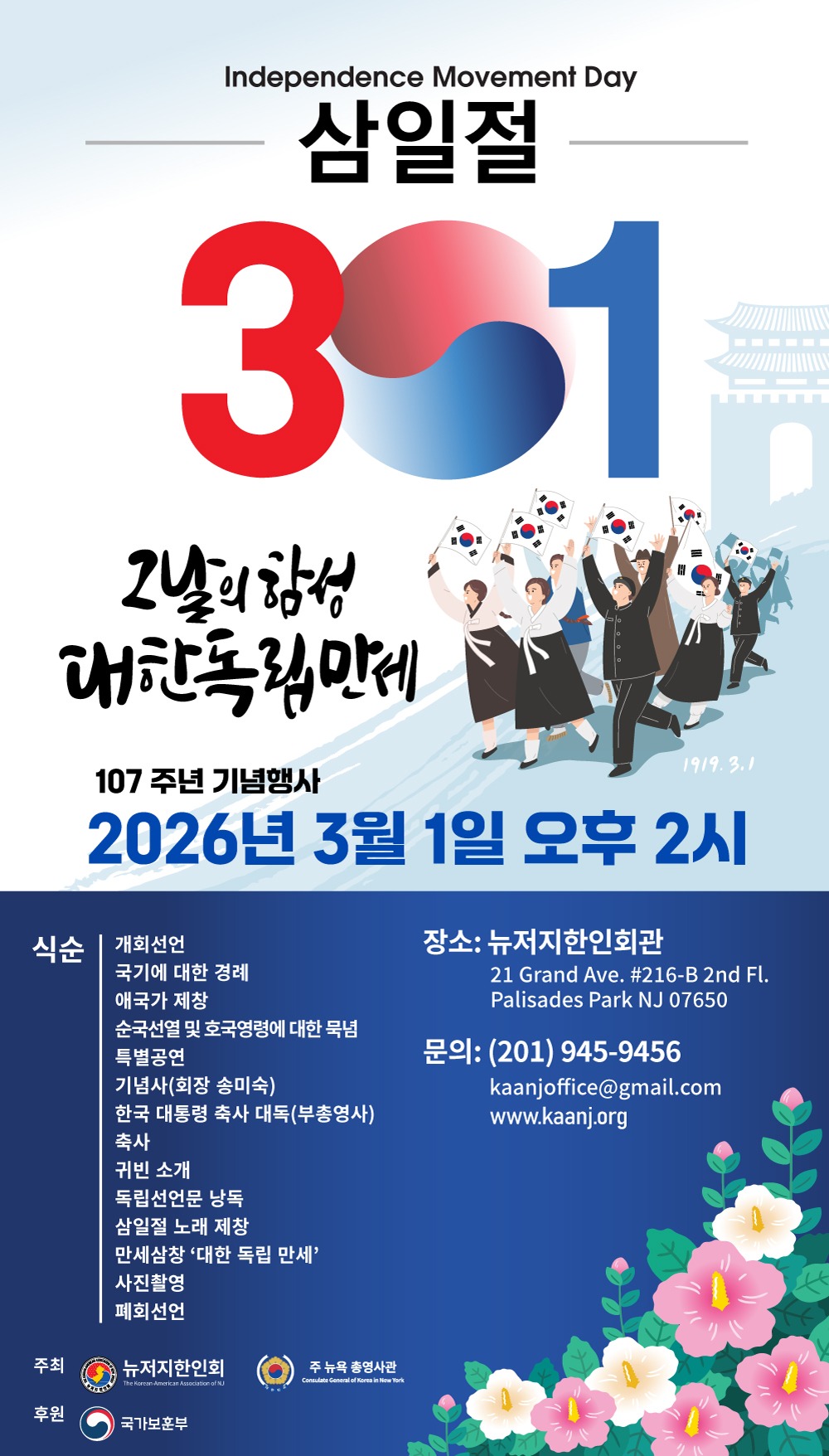 뉴저지한인회에서는 대한민국의 역사적 의미를 되새기고, 한인 사회의 화합을 도모하기 위해 제107주년 3·1절 기념식을 개최합니다.